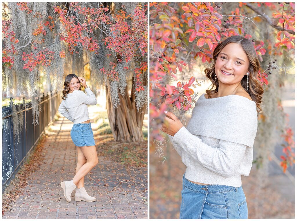 We met at the Vaughan-Smitherman Museum in downtown Selma, where the trees out front were showing off the most vibrant red leaves. They practically glowed in the sunshine and created the perfect fall backdrop. Even though it was chilly, Elle came with a clear vision for her portraits and was completely committed to wearing her dress with bare feet. One moment that stood out to me was when she recreated a childhood photo taken on one of the iron benches at the museum. Watching her sit in that same spot as a senior added such a sweet touch to the session.